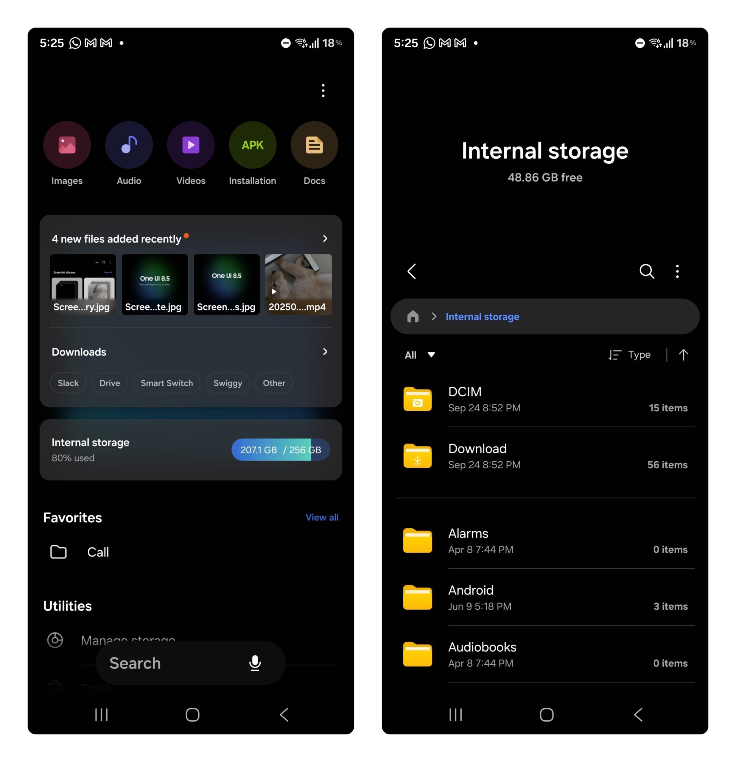Ứng dụng Tệp (My Files) cũng có thanh tìm kiếm ở phía dưới, làm nổi bật các mục quan trọng như tệp gần đây và bộ nhớ trong trên màn hình chính với nền mờ như kính.