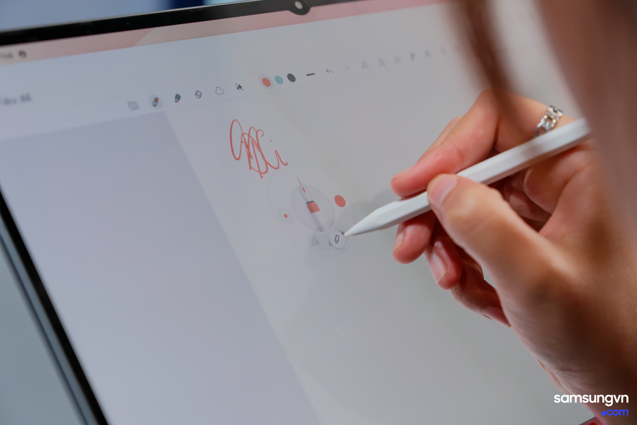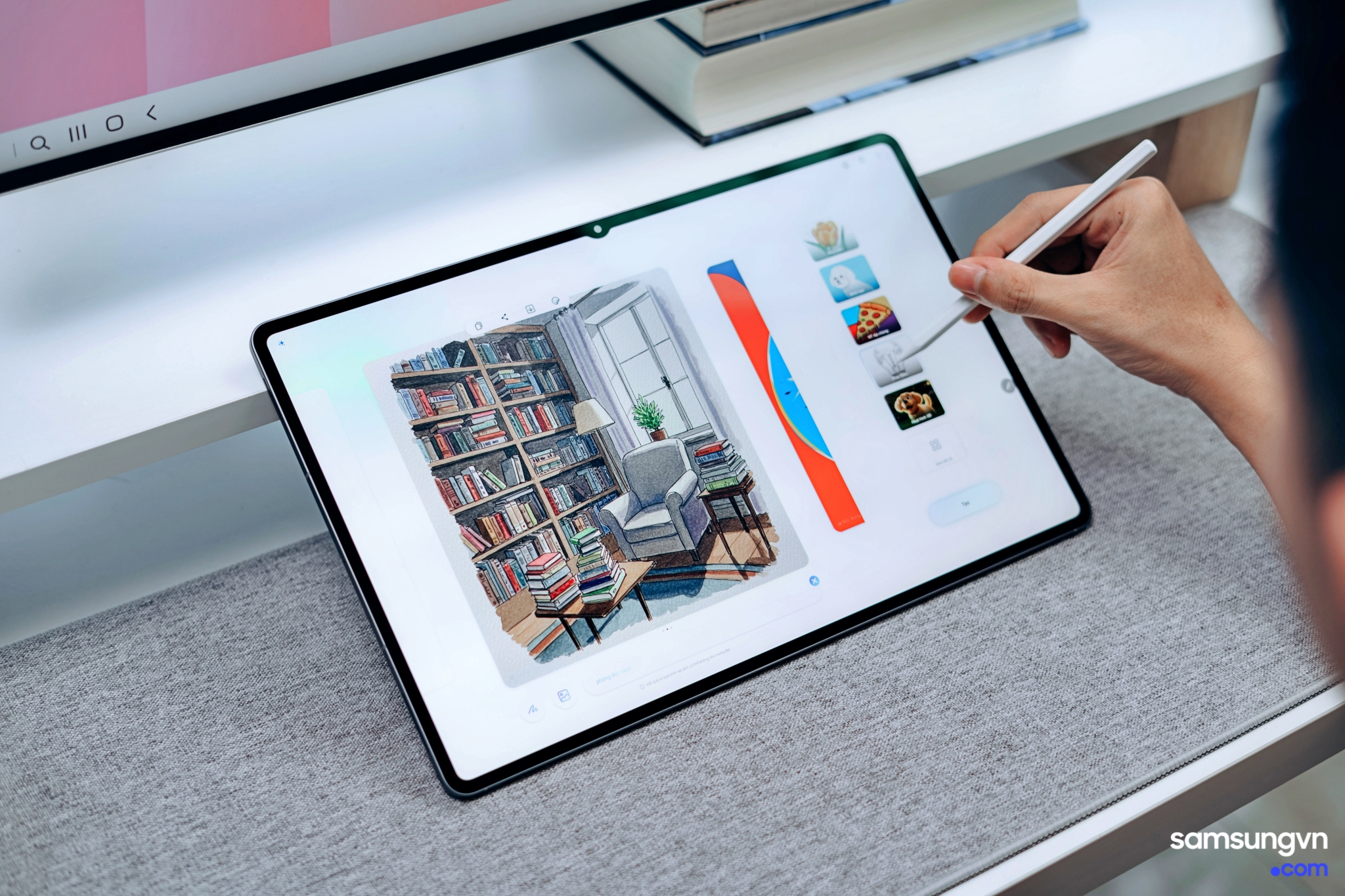 Chiếc S Pen mới trên Galaxy Tab S11 Ultra thật sự mang đến trải nghiệm viết và vẽ tự nhiên hơn bao giờ hết. Điểm mình thích là Samsung đã tinh chỉnh lại thiết kế với thân bút hình lục giác giúp cầm chắc tay, đầu bút dạng nón hỗ trợ độ nghiêng chính xác, mang lại cảm giác gần như viết trên giấy thật. Độ trễ gần như bằng 0, khiến việc ghi chú, phác thảo hay chỉnh sửa nội dung trở nên mượt mà.