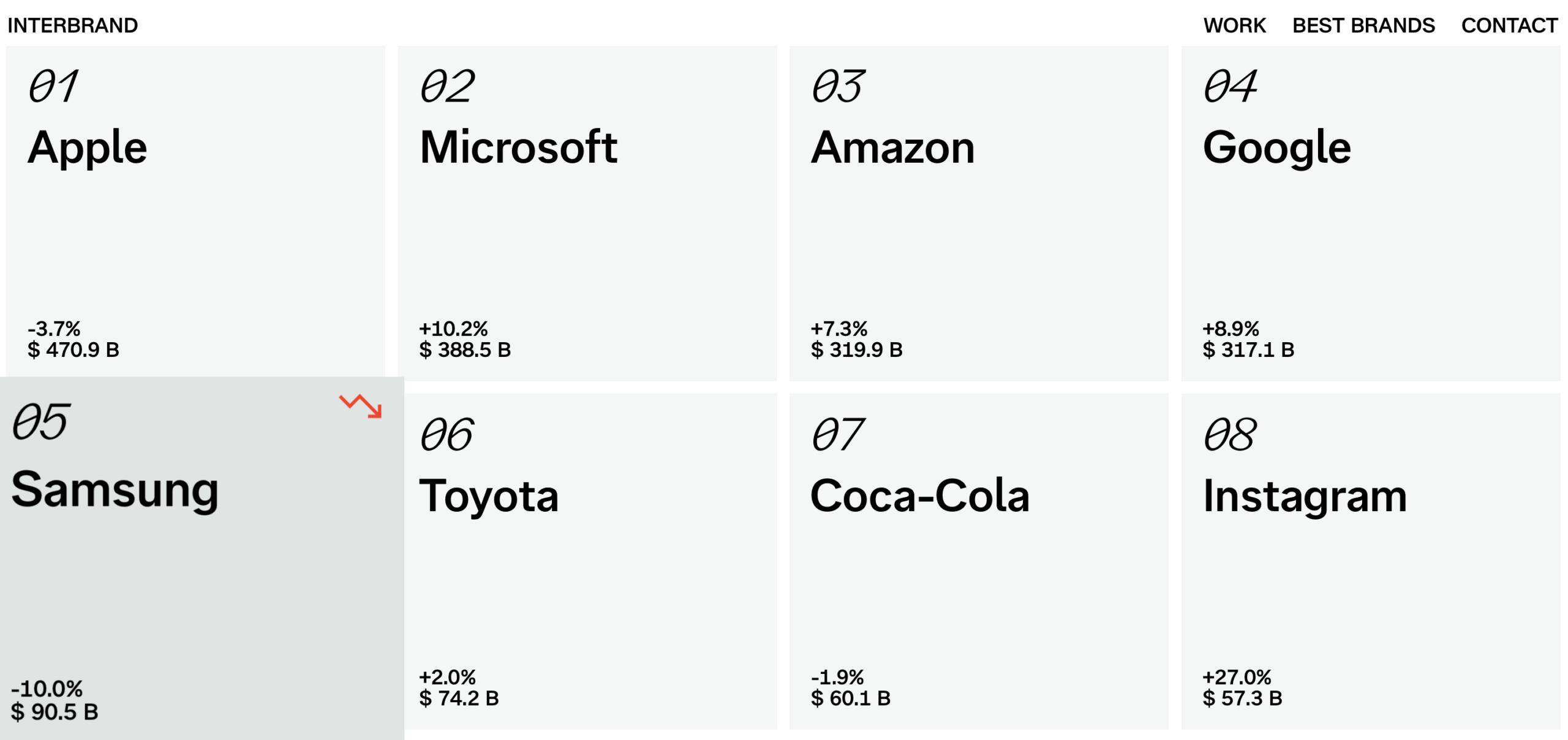 Danh sách Thương hiệu Toàn cầu Tốt nhất của Interbrand được xếp hạng dựa trên đánh giá giá trị thương hiệu, bao gồm phân tích toàn diện về hiệu suất tài chính và triển vọng của công ty, ảnh hưởng của thương hiệu đến hành vi mua hàng của khách hàng và khả năng cạnh tranh của thương hiệu (bao gồm chiến lược, sự đồng cảm, sự khác biệt, mức độ tương tác với khách hàng, tính nhất quán, niềm tin và nhiều yếu tố khác). Bảng xếp hạng này là một trong những bảng xếp hạng giá trị thương hiệu lâu đời nhất thế giới, được công nhận rộng rãi về độ tin cậy.